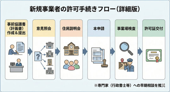 これから事業を始める場合、あるいは既存の事業者が規制に対応する場合の手続きについて解説します。