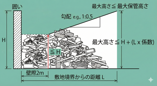 計算式例:保管高さ ≦ 囲いの高さ +(壁からの距離 × 0.6) など、条例により係数は異なりますが、ピラミッド型に積むことが基本です。