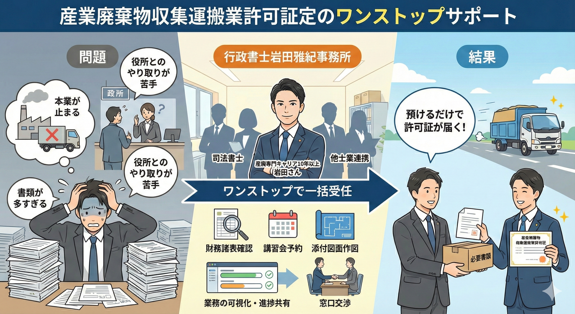 「書類が多すぎて本業が止まる」「役所とのやり取りが苦手」という声を受け、行政書士岩田雅紀事務所では産業廃棄物収集運搬業の許可取得をワンストップでサポートしています。