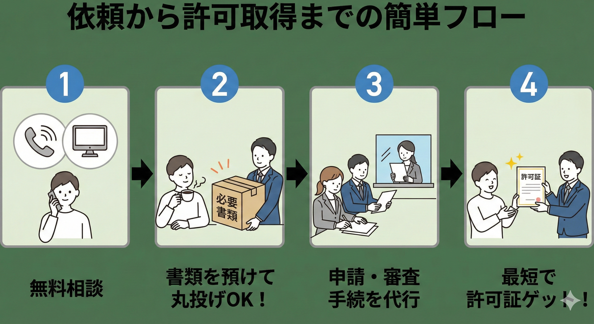 許可取得に必要な要件や書類、自治体とのやり取りの流れを詳しく紹介し、手間の掛かる手続きを行政書士へ依頼するメリットもわかりやすくまとめました。